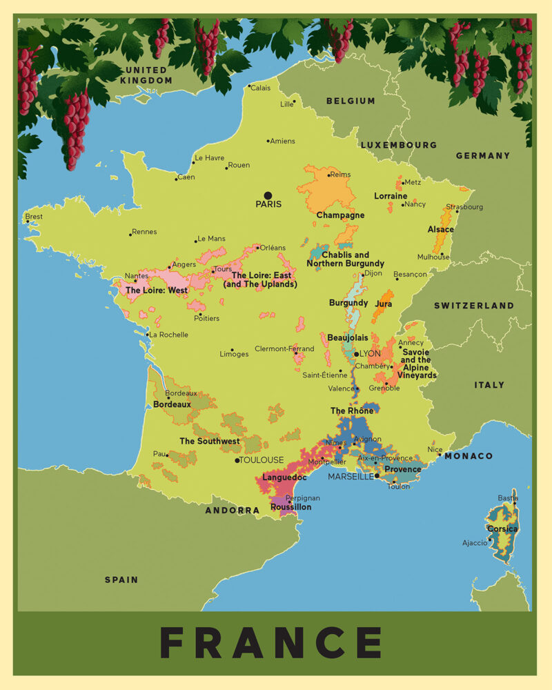 A high-quality 16″ x 20″ reproduction of the main France map from The New French Wine, with original illustrations and cartography.
