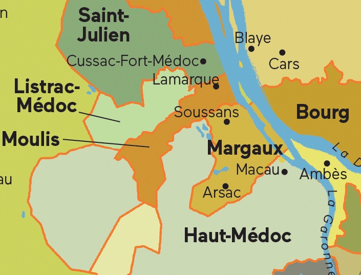 This map of Bordeaux features its major subregions and appellations, including Margaux, Pomerol, Fronsac, Graves, Entre-Deux-Mers and more, plus key towns, roads, bodies of water and other details.