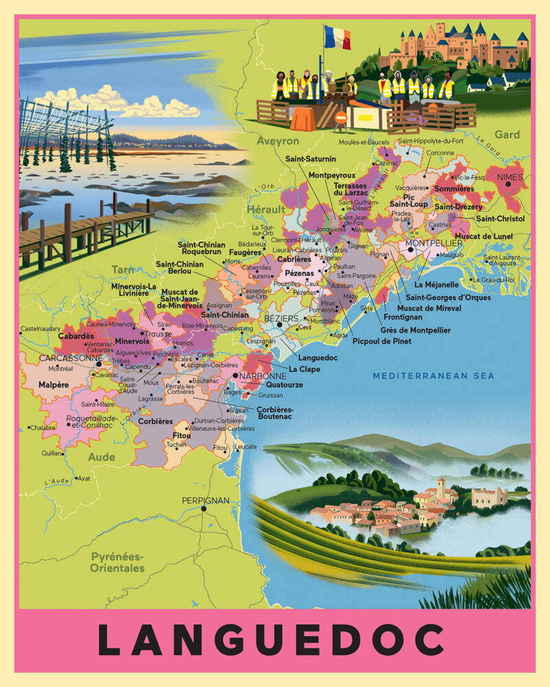 A high-quality 16″ x 20″ reproduction of the Languedoc map from The New French Wine, with original illustrations and cartography.
