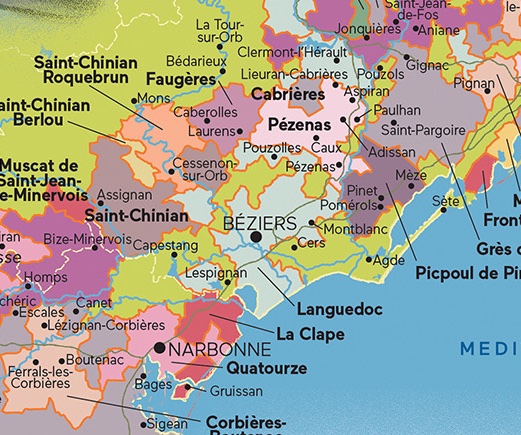 This map of Languedoc features its major subregions, including Limoux, Faugères, Corbières and more, plus key towns, roads, bodies of water and other details.