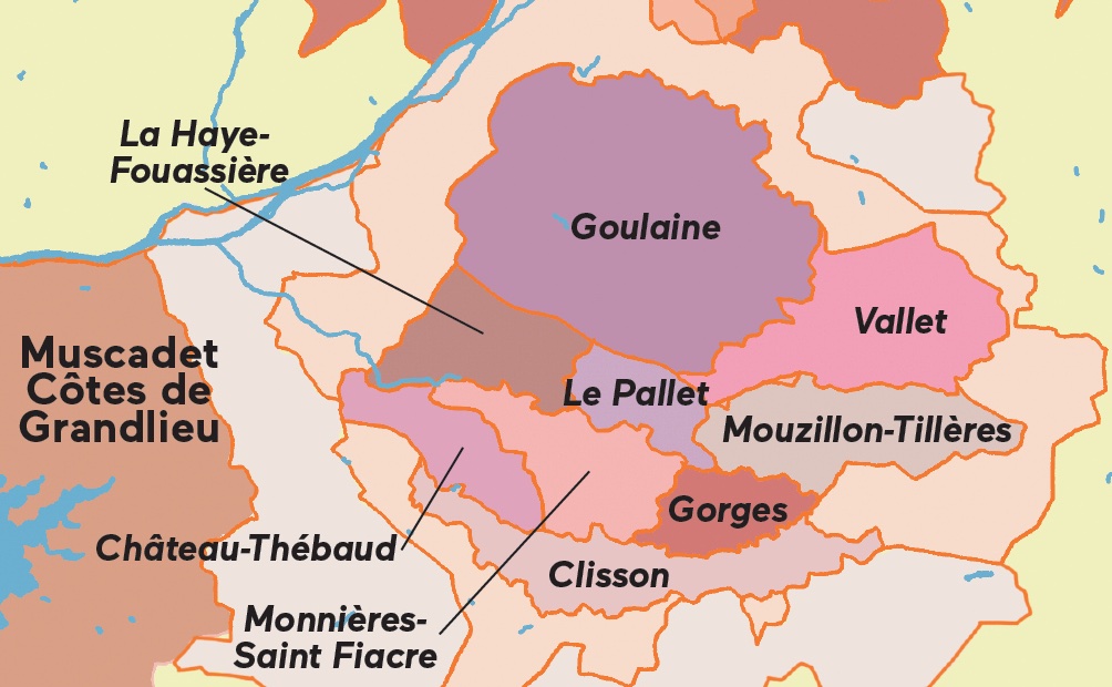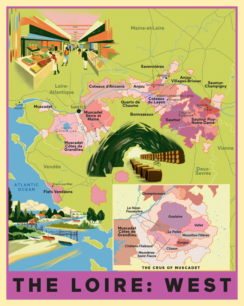 This map of the western Loire features all major wine regions, including Muscadet (along with an inset of the 10 crus), Anjou, the Fiefs Vendéens, Saumur and more, plus key towns, roads, bodies of water and other details.