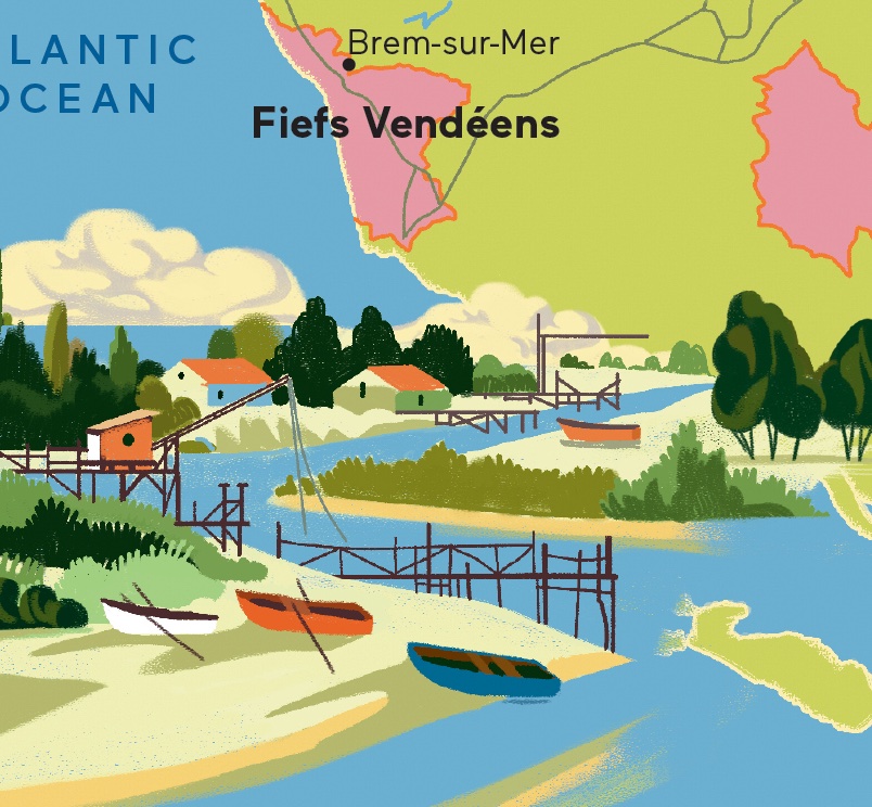 A high-quality 16″ x 20″ reproduction of the Loire West map from The New French Wine, with original illustrations and cartography.